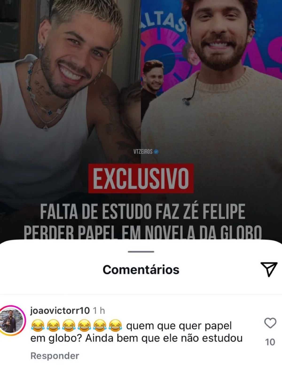 João Victor deixou comentário irônico após rumor de que Zé Felipe teria perdido papel em novela por falta de estudo.Reprodução/Redes sociais.