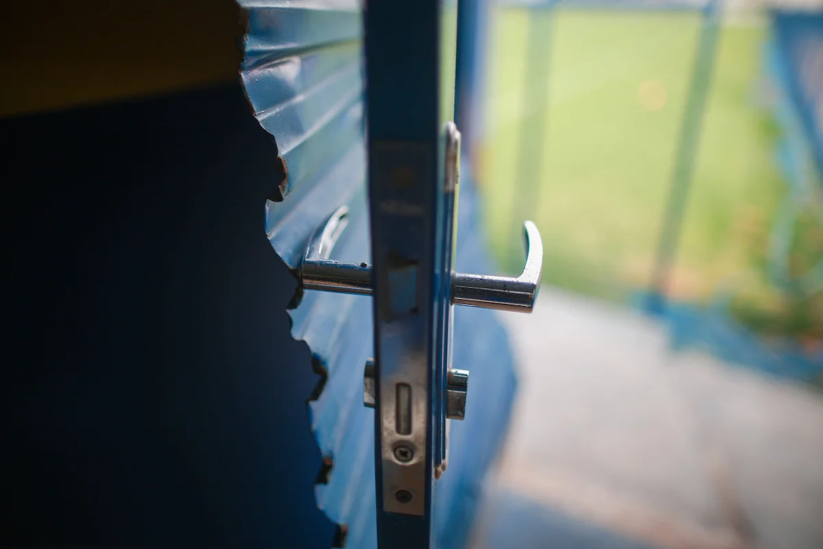 Portas dos vestiários e da sala da arbitragem estão amassadas e com fechaduras trincadasLuis Nova / Especial Metrópoles