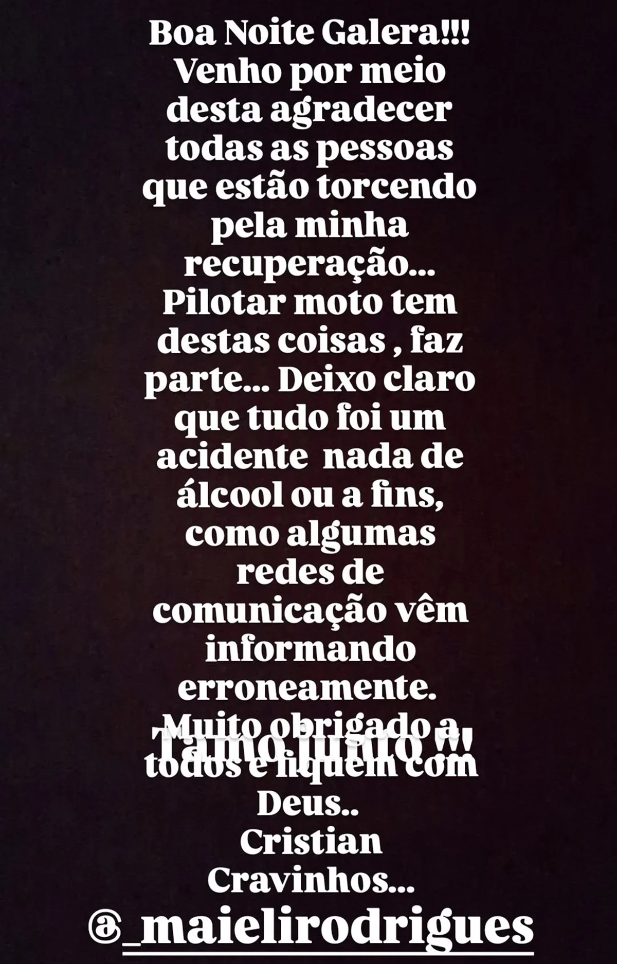 Cristian Cravinhos voltou às redes sociais, na noite de quinta-feira (13/11), para falar sobre o acidente de moto que sofreu no dia anterior e agradeceu o apoio que vem recebendo desde então.