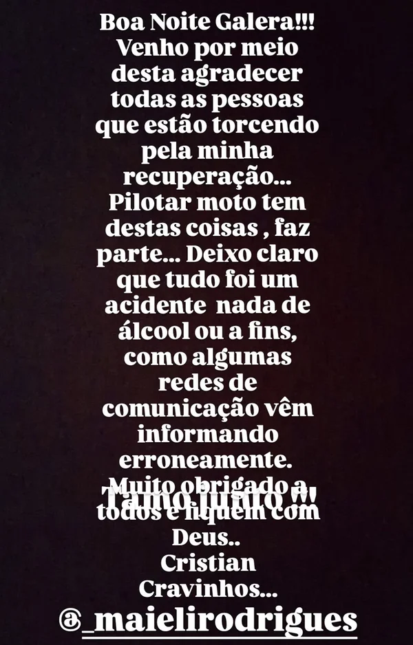 Nos stories do Instagram, o ex-cunhado de Suzane von Richthofen desabafou: “Boa noite, galera!!! Venho por meio desta agradecer todas as pessoas que estão torcendo pela minha recuperação… Pilotar moto tem destas coisas, faz parte…”, começou.