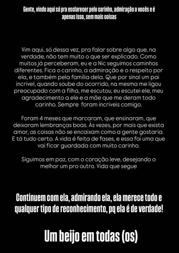 “Gente, vindo aqui só pra esclarecer pelo carinho, admiração a vocês e é apenas isso, sem mais coisas. Vim aqui, só dessa vez, pra falar sobre algo que, na verdade, não tem muito o que ser explicado. Como muitos já perceberam, eu e a Nic seguimos caminhos diferentes”, começou o artista.