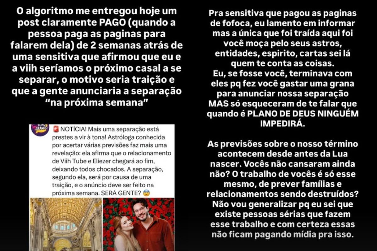 “O algoritmo me entregou hoje um post pago de duas semanas atrás de uma sensitiva que afirmou que eu e a Viih seríamos o próximo casal a se separar. O motivo seria traição, e que a gente anunciaria a separação ‘na próxima semana’”, disse Eliezer nos Stories do Instagram.