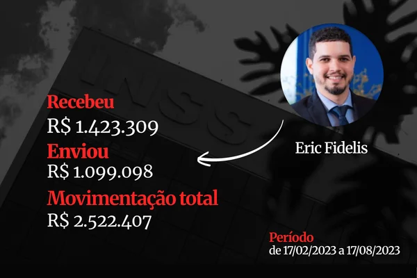 O advogado Eric Fidelis, filho do ex-diretor de Benefícios e Relacionamento com o Cidadão do Instituto Nacional do Seguro Social (INSS), movimentou R$ 23.506.314 de fevereiro de 2023 a julho de 2025, mostram relatórios obtidos pela coluna. As transações suspeitas ocorreram tanto na conta bancária conjunta com a esposa quanto na do escritório de advocacia que leva o nome dele.