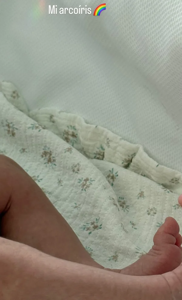 “Meu arco-íris”, babou ela na legenda da imagem em que aparece apenas o pezinho do recém-nascido.