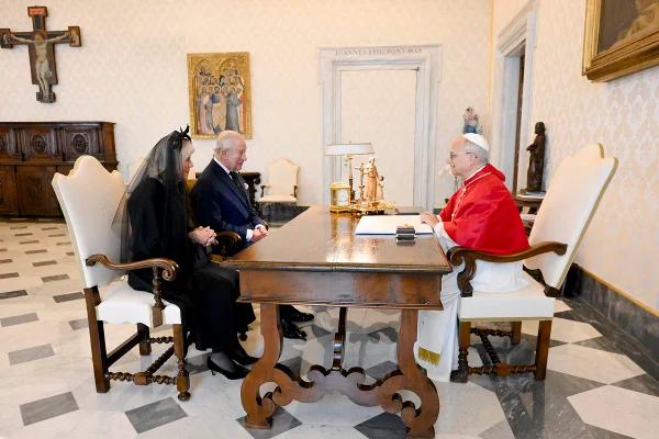 Momento da audiência do líder da Igreja Católica com os monarcas do Reino Unido Vatican Media via Vatican Pool/Getty Images