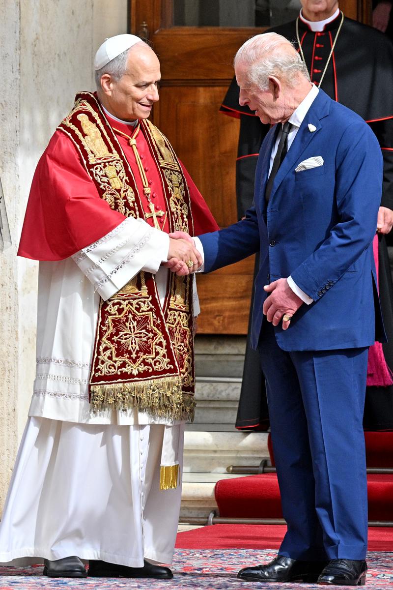 Cumprimento do papa Leão XIV e do rei Charles III Simone Risoluti - Vatican Media viaVatican Pool/Getty Images