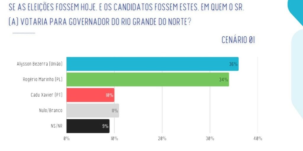 Em nova pesquisa para o Governo do Rio Grande do Norte, divulgado pelo instituto Real Time Big Data neste sábado (13), o atual prefeito de Mossoró, Allyson Bezerra, aparece na frente com uma pequena vantagem de dois pontos percentuais em relação ao senador Rogério Marinho. Allyson aparece com 36%, enquanto Marinho surge logo atrás, com 34%. Já Cadu Xavier registra 10%, seguido por 11% de votos nulos ou brancos e 9% que não souberam responder.