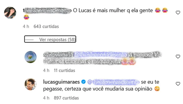 O vídeo de Hariany circulou por perfis de fofoca e, em um deles, uma internauta zombou da sexualidade de Lucas Guimarães. “O Lucas é mais mulher que a gente”, riu a mulher. O influenciador, no entanto, resolveu rebater: “Se eu te pegasse, certeza que você mudaria sua opinião”, escreveu o ex-marido de Carlinhos Maia.