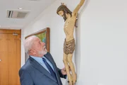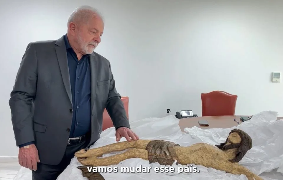 Lula mostra escultura de Jesus Cristo que ficará no gabinete da Presidência da RepúblicaReprodução/vídeo