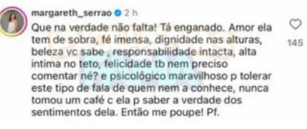 Margareth Serrão saiu em defesa de Virginia após comentário de internauta