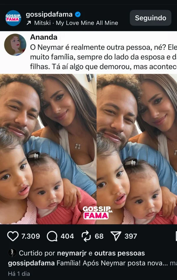 “O Neymar é realmente outra pessoa né? Ele tá muito família, sempre do lado da esposa e das filhas. Tá aí algo que demorou, mas aconteceu”, escreveu a fã.