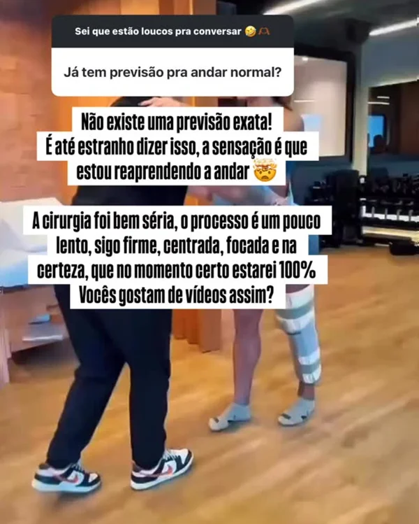 Uma outra seguidora perguntou, ainda, se Gracyanne Barbosa tinha previsão para voltar a andar normalmente: “Não existe uma previsão exata! É até estranho dizer isso: a sensação é que estou reaprendendo a andar. A cirurgia foi bem séria, o processo é um pouco lento. Sigo firme, centrada, focada e na certeza que, no momento certo, estarei 100%”, garantiu ela.