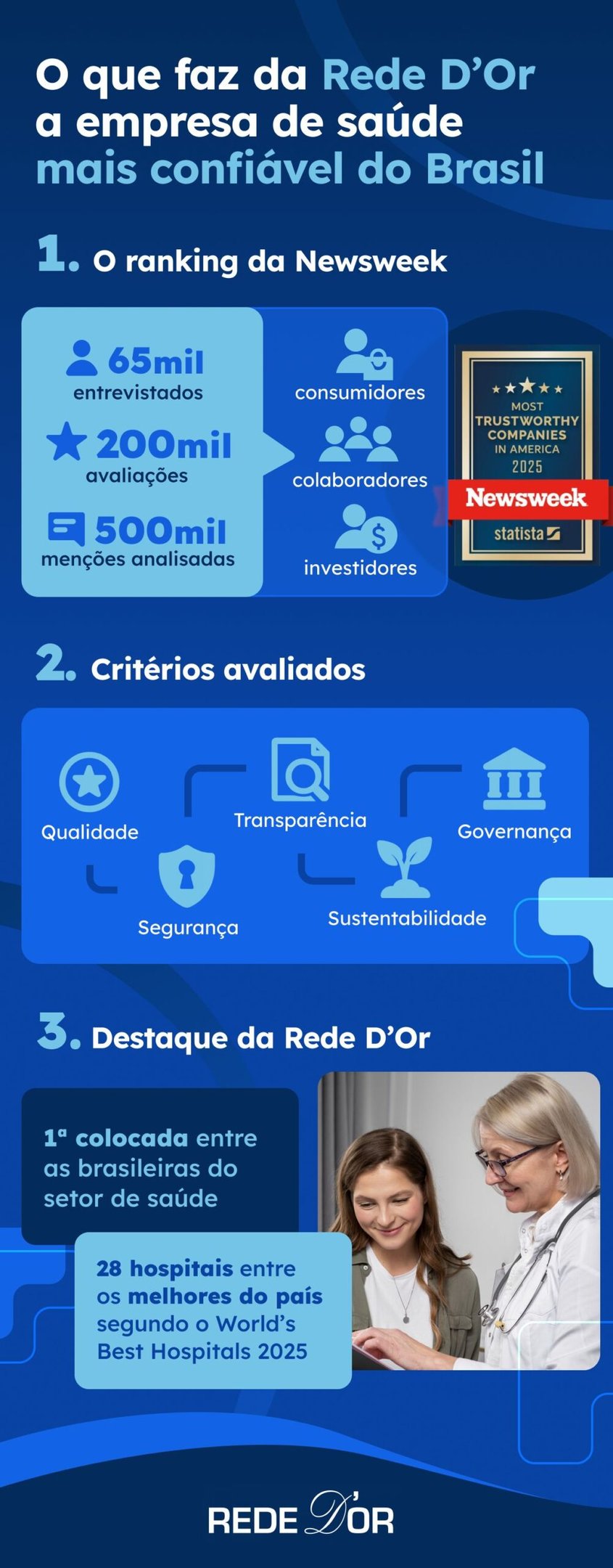 O ranking global World’s Most Trustworthy Companies 2025, da revista Newsweek, apontou a Rede D’Or como a empresa de saúde mais confiável do Brasil. O levantamento é um dos mais respeitados do mundo corporativo e ouviu 65 mil pessoas em 20 países, somando 200 mil avaliações e meio milhão de menções analisadas na internet.