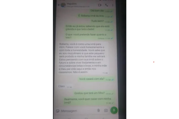 Em uma das mensagens recuperadas pela investigação, Ana escreveu: “Você vai me deixar sozinha com seu filho? Eu te amo, Hayder, e nosso bebê também.” Roberta, que também trocava mensagens com o tunisiano, reforçava a farsa para aumentar a pressão: