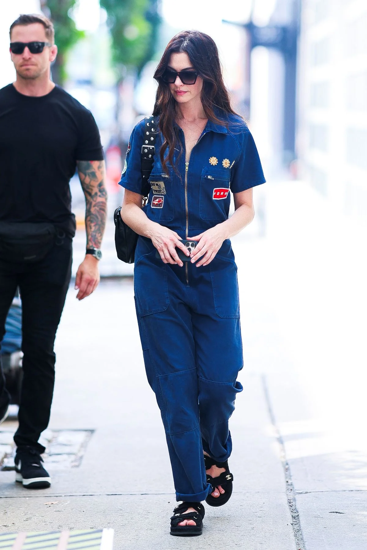 A atriz foi fotografada usando um macacão jeans com patches e sandálias ChanelAeon/GC Images via Getty Images