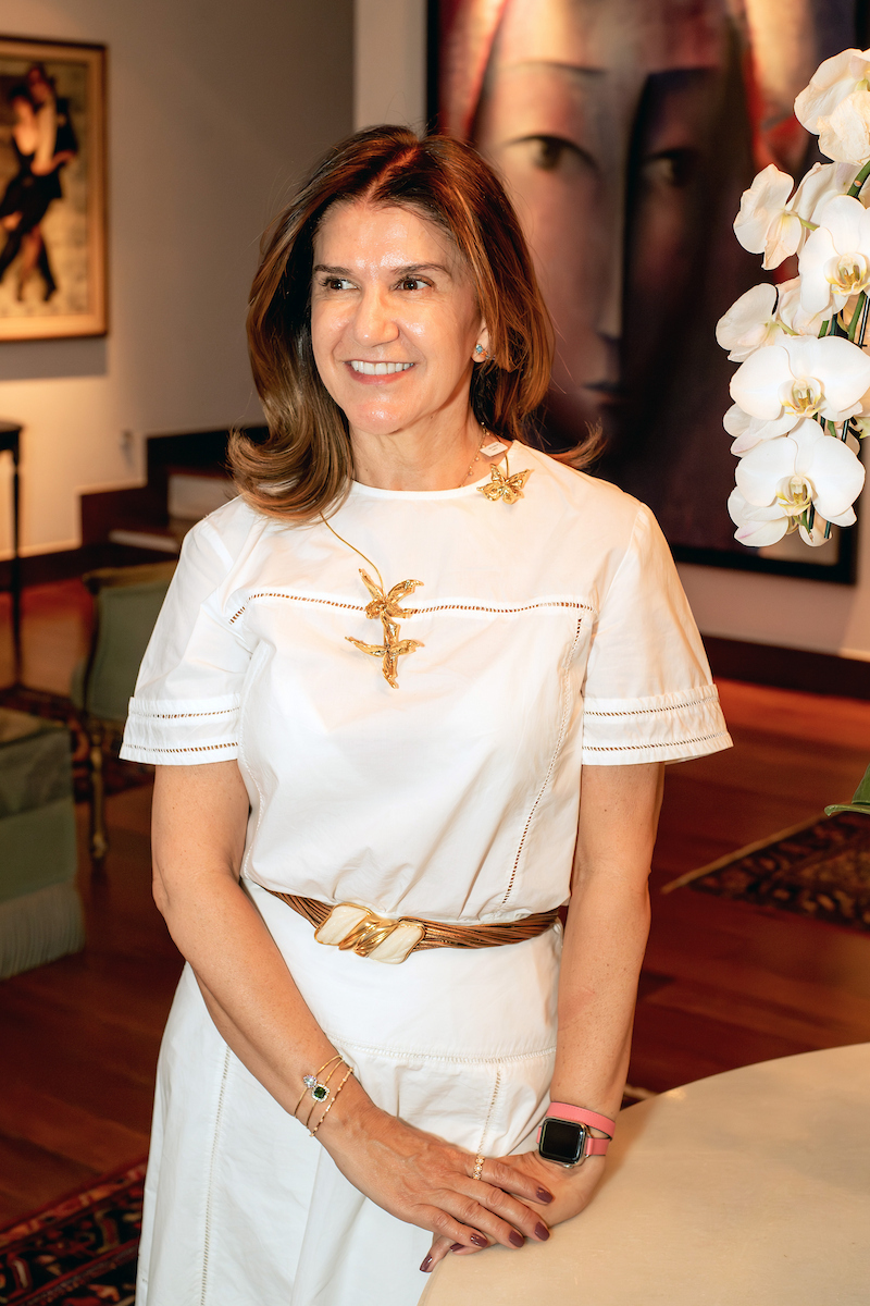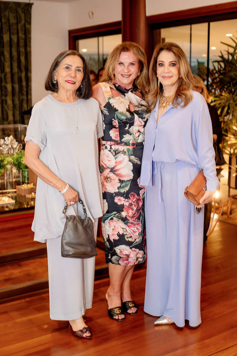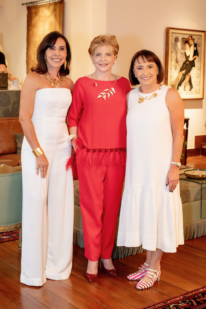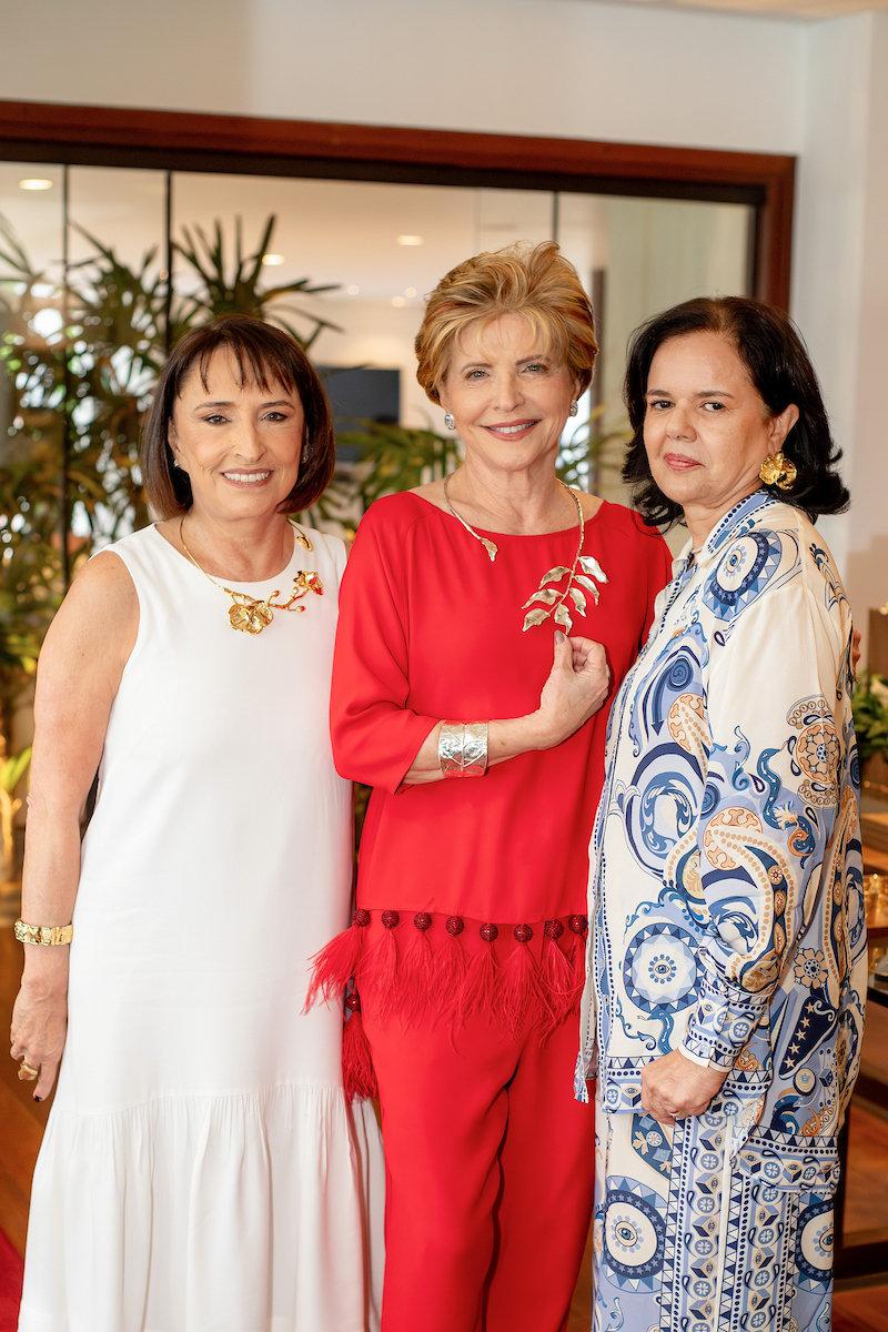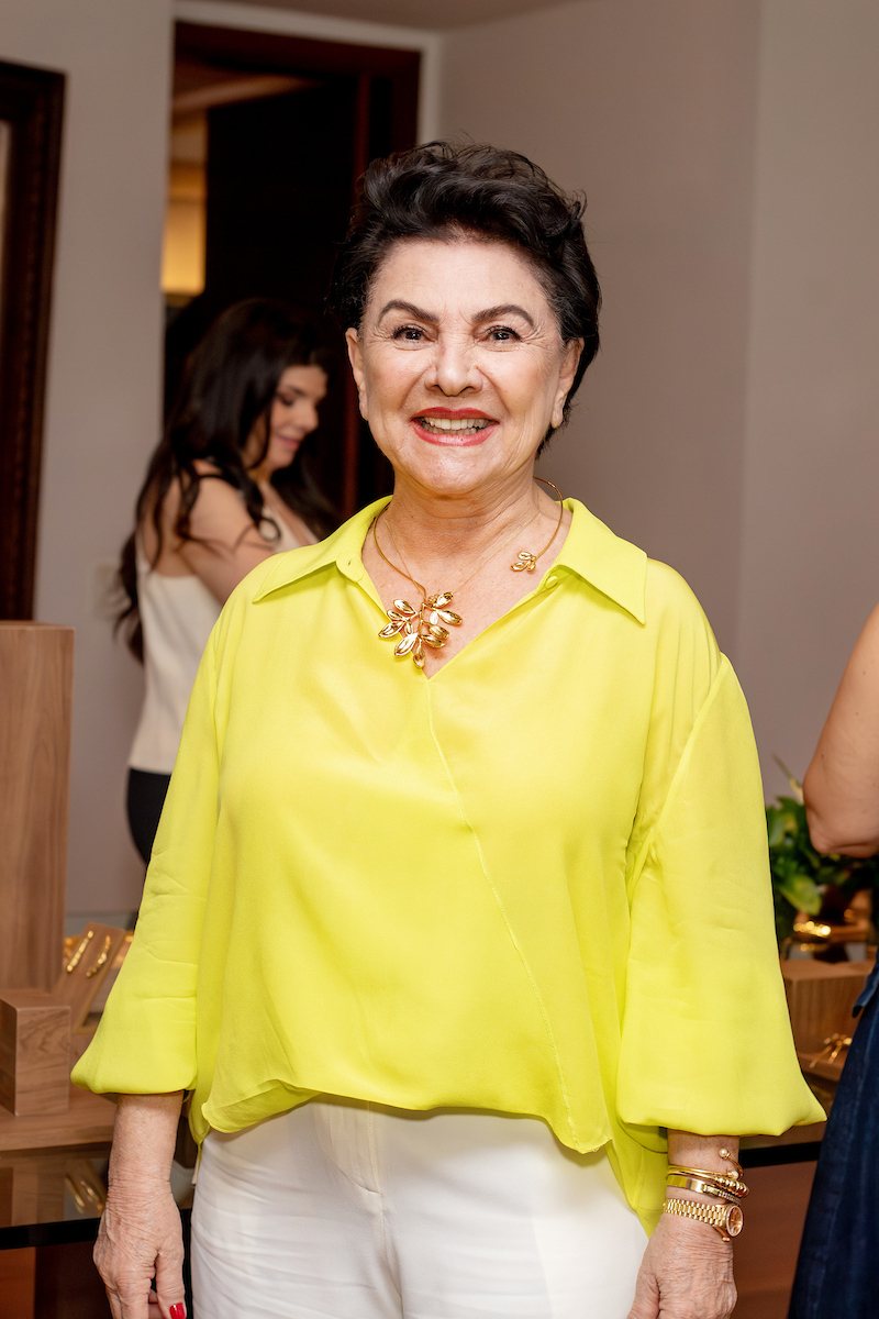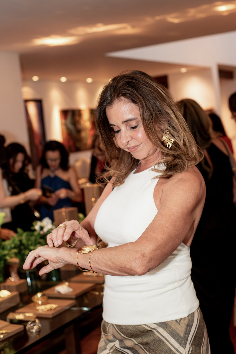 A história que uniu as anfitriãs à etiqueta nasceu de um acaso encantador: Valeska se apaixonou por um colar usado por Vera, uma peça feita a partir de uma folha real, eternizada em metal precioso. “Ela ficou encantada e quis saber mais. Vera explicou que era uma folha de verdade, e Valeska imediatamente compreendeu a poesia e a arte por trás do trabalho”, contou Fernanda Dubeux, diretora criativa da Verde Joias.
